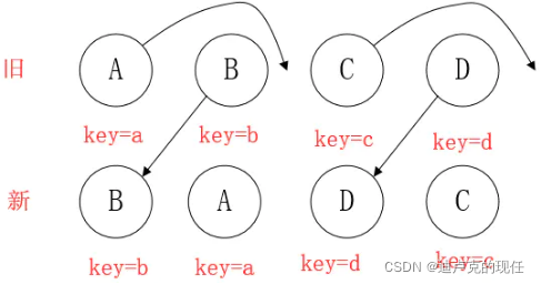 ****移动:****组件D已经在集合(A,B,C,D)里了,且集合更新时,D没有发生更新,只是位置改变,如新集合(A,D,B,C),D在第二个,无须像传统diff,让旧集合的第二个B和新集合的第二个D 比较,并且删除第二个位置的B,再在第二个位置插入D,而是 (对同一层级的同组子节点) 添加唯一key进行区分,移动即可。