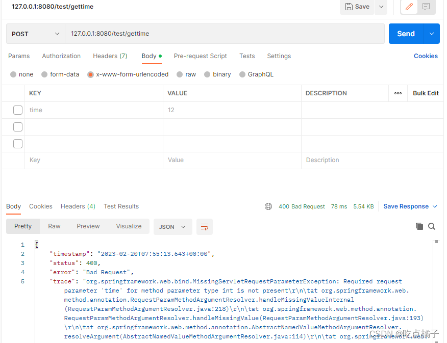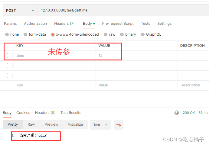 上面的例子中,如果我们在发送请求时不传参数的话,后端getTime方法中的参数TIME应该是默认值null,但实际上我们的代码会报错: