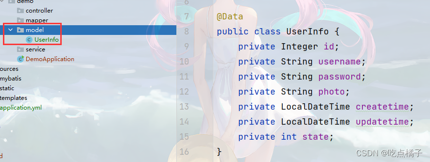 该实体类是对mycnblog数据库中userinfo表的描述,并且需要实现每个字段的get和set方法。