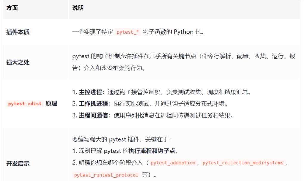 Pytest-xdist 的强大完全建立在 Pytest 的钩子机制之上。它通过实现一系列钩子函数来嵌入和控制 Pytest 的执行流程。