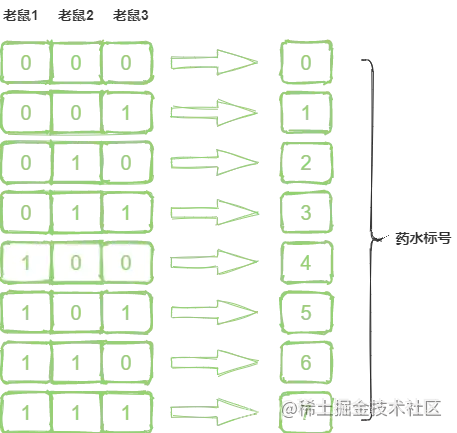 中毒的老鼠标号为1,未中毒的老鼠标号为0,将三只老鼠标号组合到一起即为有毒药水的标号。
