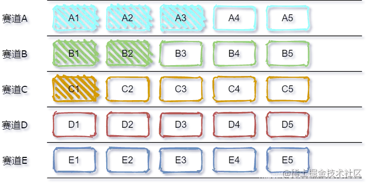 第六次:将A1、B1、C1、D1、E1放到一个赛道上找出第一名,假设为A1,其他四名分别为B1、C1、D1、E1。这时第一名已经找到了,还需找到二、三名。因为C1的速度比D1和E1的速度快,所以赛道D和赛道E的所有马都被淘汰了。有机会成为二、三名的马为A2、A3、B1、B2、C1这五匹马,即前五名在这个区域,并且第一名为A1。如下图