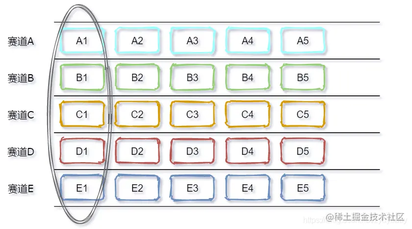 前五次:将25匹马放到5个赛道比赛,找出每个赛道的第一名。假设A1、B1、C1、D1、E1分别为每组的第一名,如下图。