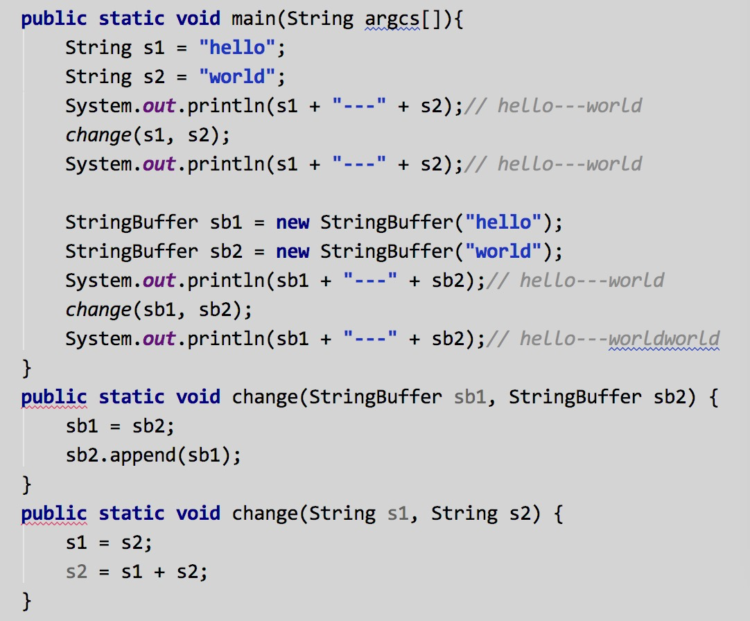 这是一个最基础的值传递和引用传递的例子,你觉得好简单,已经想跃跃欲试的挑战了,那么请看下面的,StringBuffer很好理解,但是当你执行一遍之后发现是不是和预想中的输出不一样呢?String不是引用类型吗,怎么会这样呢?如果你无法理解,那么请看下String的实现源码,了解下其在内存中分配的实现原理。