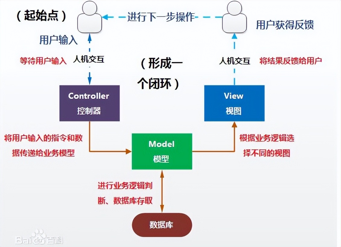 Controller(控制器):接收用户请求,委托给模型进行处理(状态改变),处理完毕后把返回的模型数据返回给视图,由视图负责展示。 也就是说控制器做了个调度员的工作。