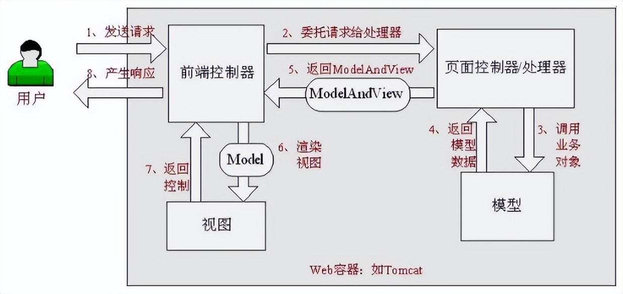 当发起请求时被前置的控制器拦截到请求,根据请求参数生成代理请求,找到请求对应的实际控制器,控制器处理请求,创建数据模型,访问数据库,将模型响应给中心控制器,控制器使用模型与视图渲染视图结果,将结果返回给中心控制器,再将结果返回给请求者。
