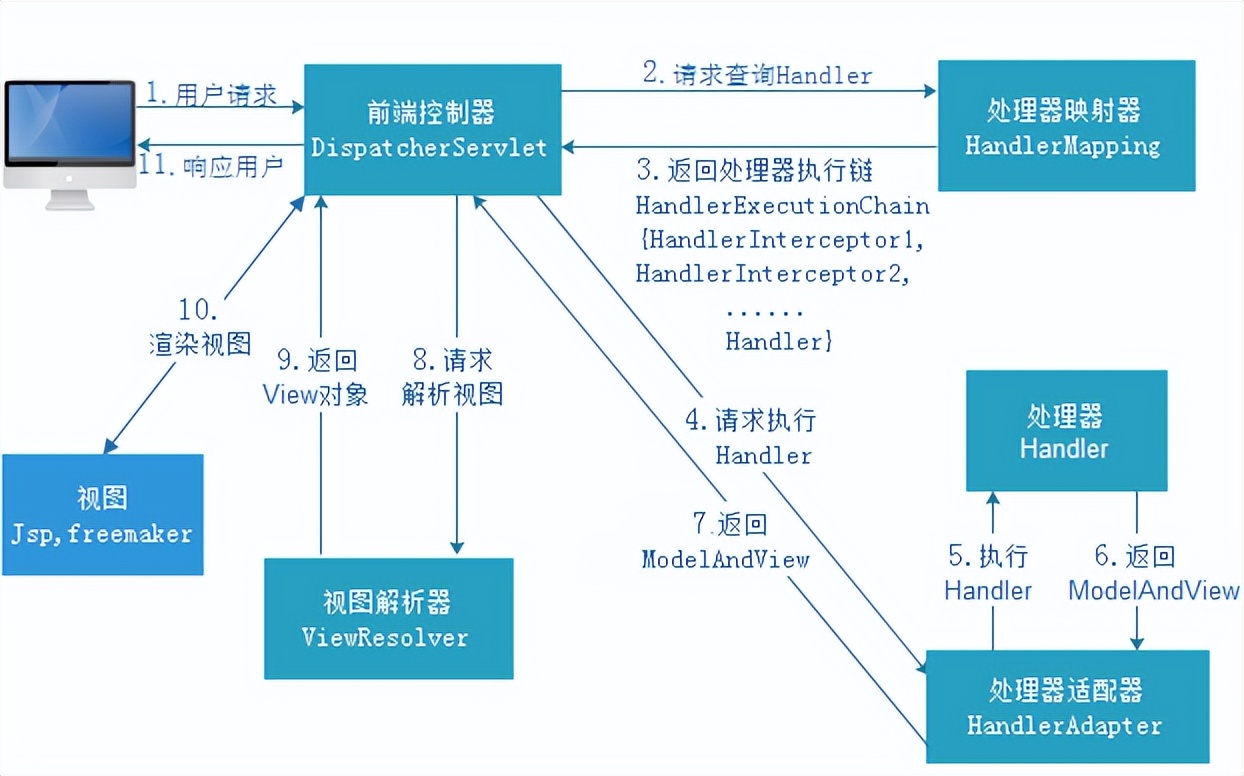 1、DispatcherServlet表示前置控制器,是整个SpringMVC的控制中心。用户发出请求,DispatcherServlet接收请求并拦截请求。