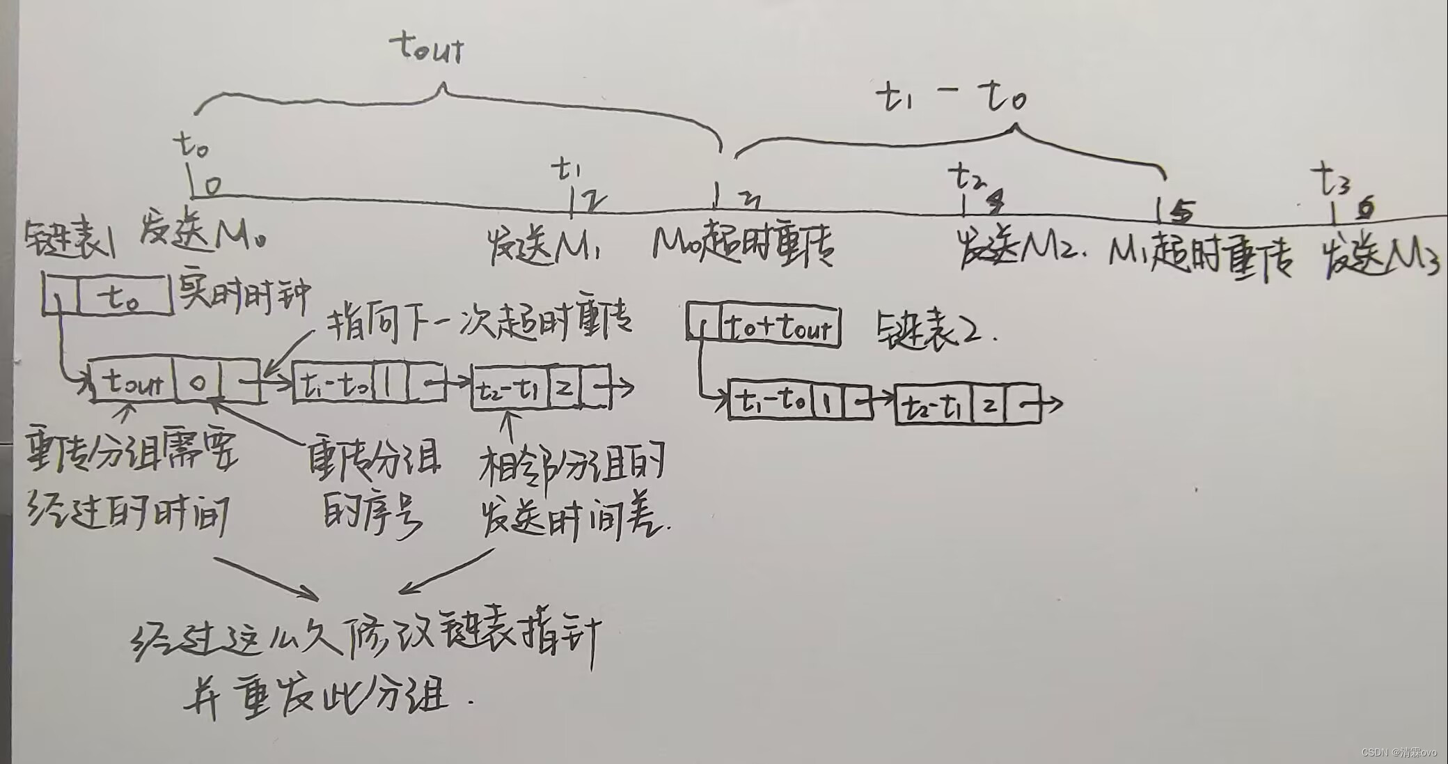 举个例子,假定tout = 3s,发送相邻分组的时间差都是2s。t0时刻,发送报文M0,生成链表1。经过3s后M0超时重传,指针指向序号为1的结构体,即生成链表2。再经过t1-t0 = 2s后,M1超时重传,指针指向序号为2的结构体......抛开例子,一般情况下(即发送相邻分组的时间差不同、tout小于发送相邻分组时间差......等等情况)都适用。
