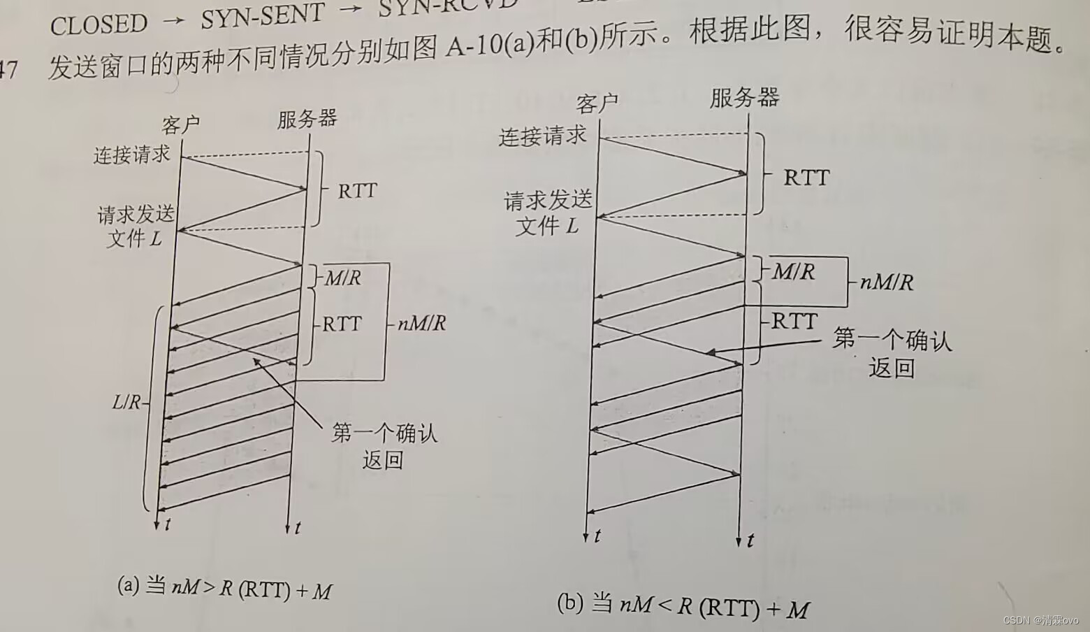 第二种情况:n M < R ∗ R T T + M nM<R*RTT+MnM<R∗RTT+M时,服务器发送完窗口内容还未收到确认,只能等待M / R + R T T + n M / R M/R+RTT+nM/RM/R+RTT+nM/R时间后才能再次发送,一次发送nM字节,所以需要发送K = ⌈ L / ( n M ) ⌉ K=\lceil L/(nM) \rceilK=⌈L/(nM)⌉次。需要K-1个间隔,所以得证。