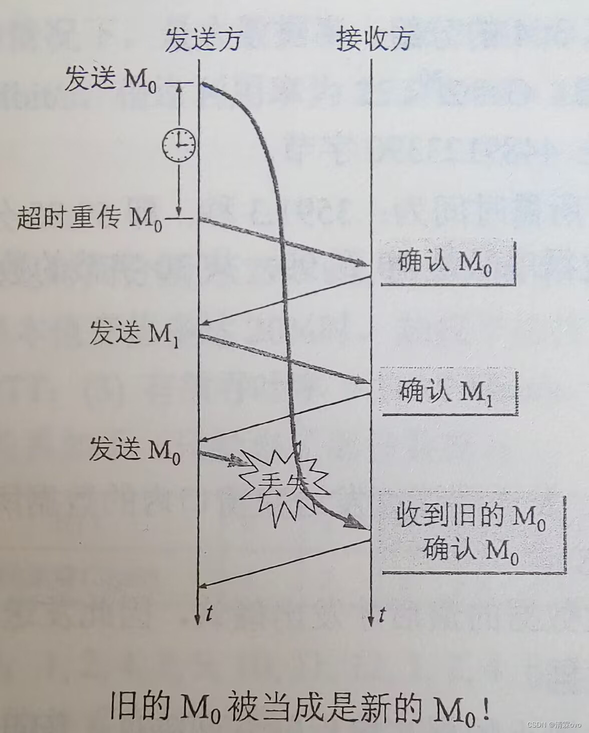 5-18 假定在运输层使用停止等待协议。发送发在发送报文段M0后在设定的时间内未收到确认,于是重传M0,但M0又迟迟不能到达接收方。不久,发送方收到了迟到的对M0的确认,于是发送下一个报文段M1,不久就收到了对M1的确认。接着发送方发送新的报文段M0,但这个新的M0在传送过程中丢失了。正巧,一开始就滞留在网络中的M0现在到达接收方。接收方无法分辨M0是旧的。于是收下M0,并发送确认。显然,接收方后来收到的M0是重复的,协议失败了。试画出类似于图5-9所示的双方交换报文段的过程。