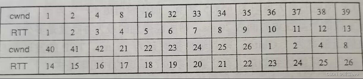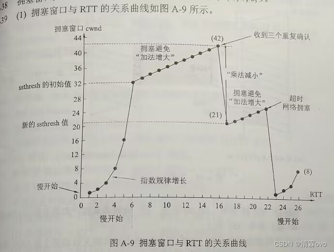 (4)在RTT=16之后发送方是通过收到三个重复的确认(因为下一个RTT执行了快恢复算法,cwnd减半),在RTT=22之后发送方是通过超时(因为下一个RTT执行了慢开始算法,cwnd=1)。
