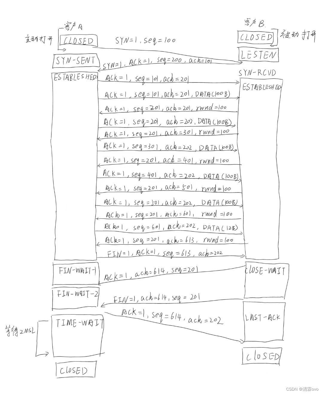 当 A 和 B 都作为客户,即同时主动打开 TCP 连接。这时的每一方的状态变迁都是: CLOSED->SYN-SENT->SYN-RCVD->ESTABLISHED