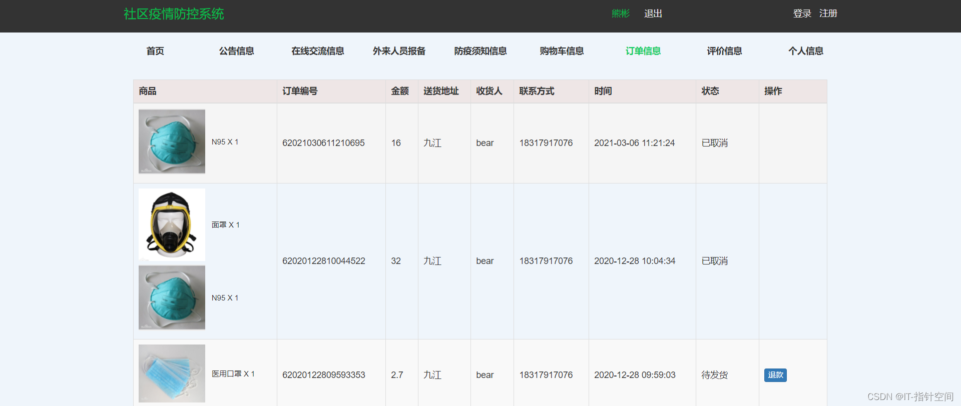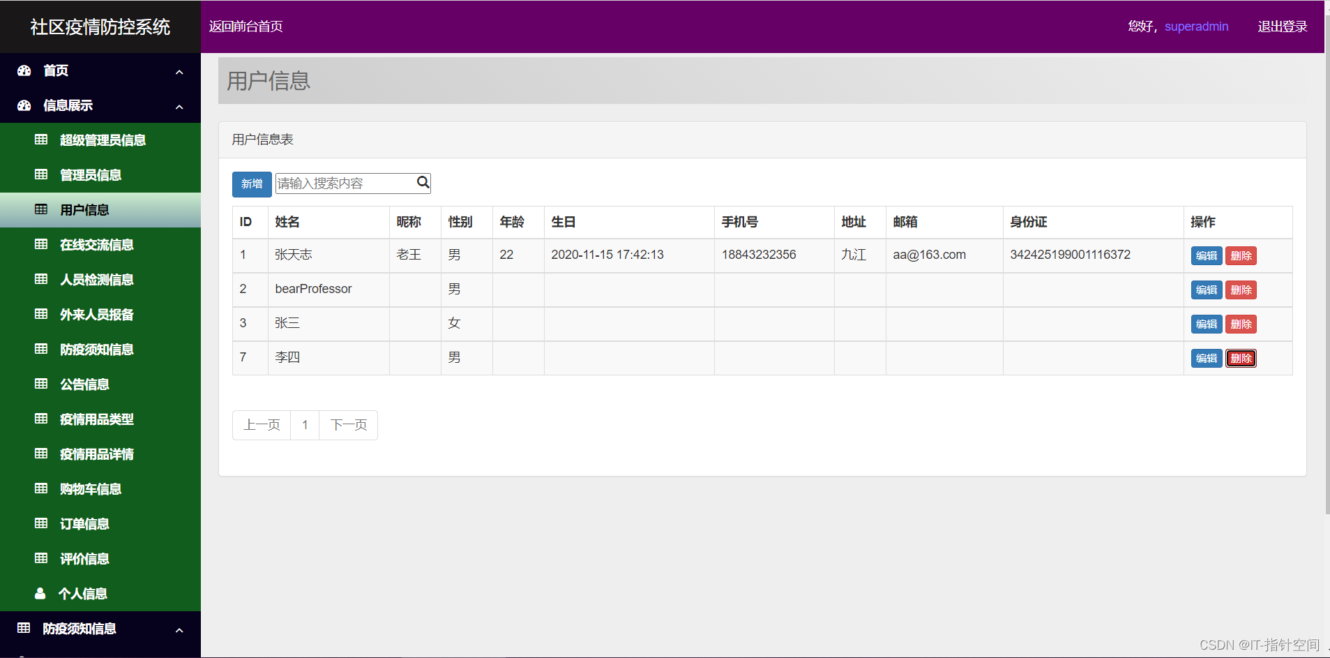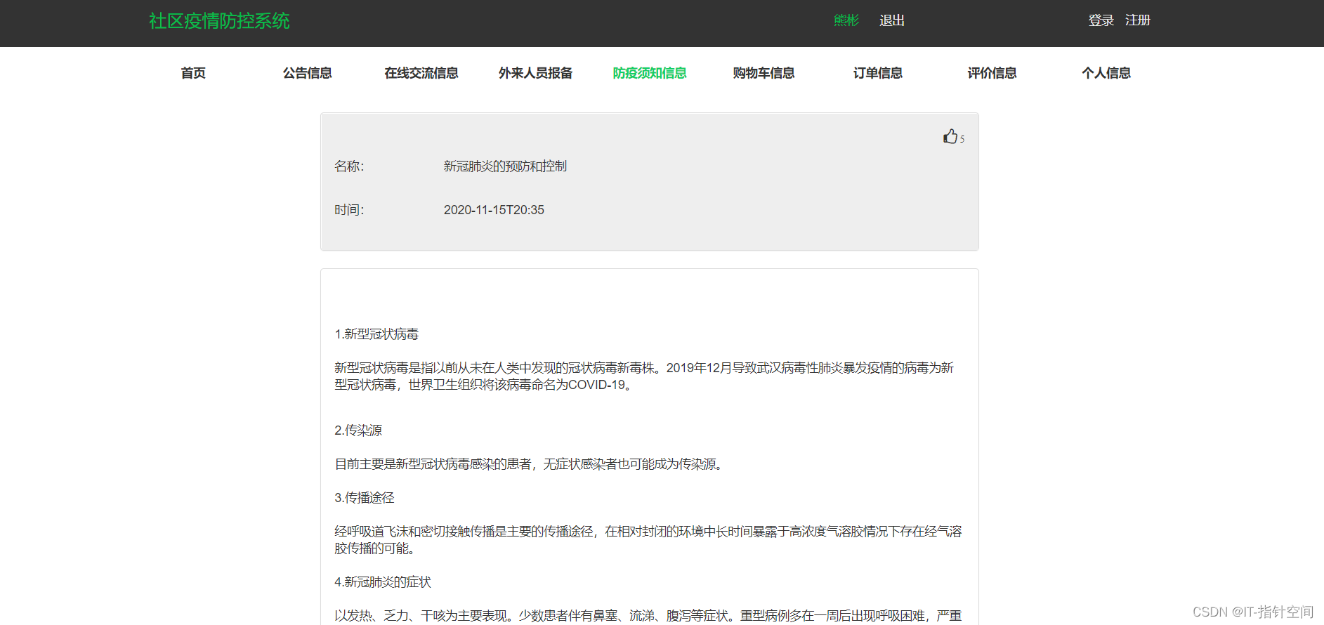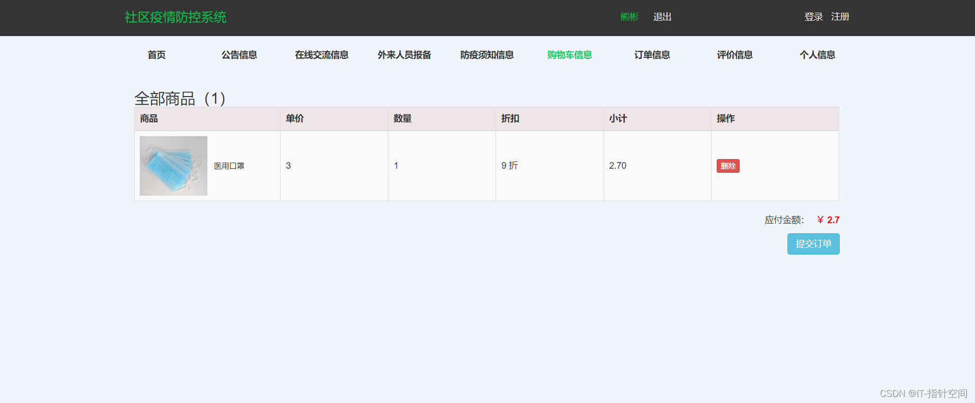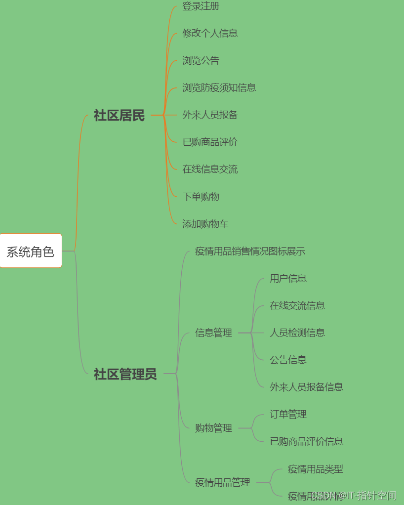 本系统是前后端分离项目,前台主要是普通社区用户使用。前台主要分为防控疫情物资的购买,社区疫情的公告展示,疫情最新动态展示。在线信息交流等。其中防控疫情物资的购买是核心模块,它分为购物商品的详情展示,用户购买商品,订单信息展示等。后台针对社区管理员管理而设计的,主要的功能有信息管理,疫情用品管理,人员检测管理,三大模块,信息管理包括超级管理员信息,管理员信息,个人信息,用户信息,在线交流信息,评价信息等。