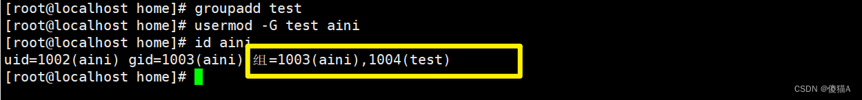 [root@localhost tmp]# usermod -G test aini # 将aini用户也添加到test组
