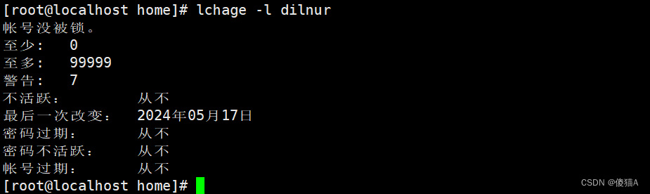 [root@localhost ~]# lchage -l dilnur # 查看用户详细信息