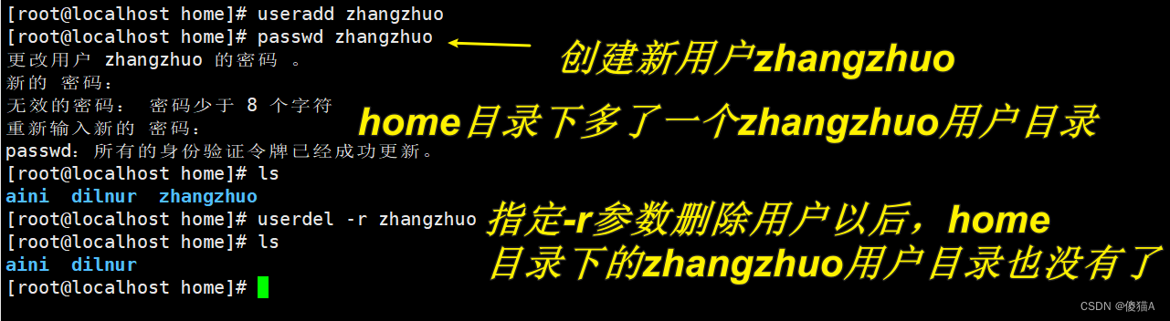userdel -r dilnur # 删除用户,并删除用户相关目录