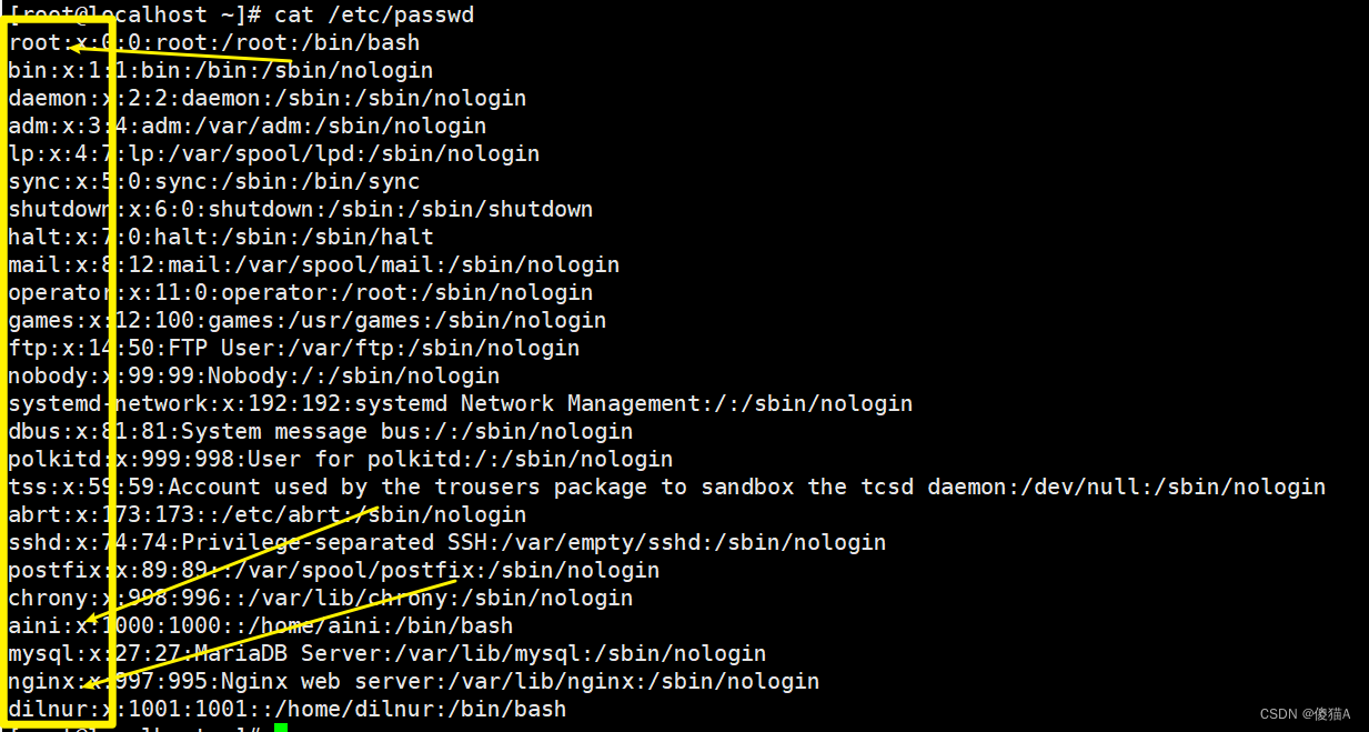 所有的用户信息存储在/etc/passwd文件中,每创建一个用户该文件就会多一行记录