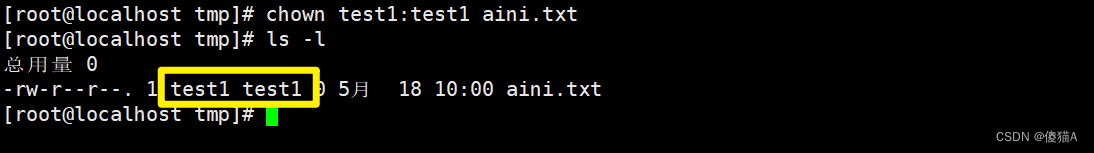 [root@localhost tmp]# chown test1 aini.txt # 把aini.txt用户改成test1用户