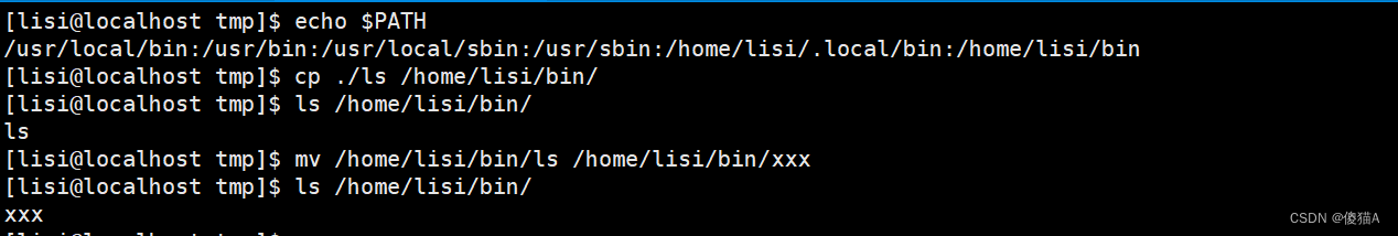 [lisi@localhost tmp]$ mv /home/lisi/bin/ls /home/lisi/bin/xxx