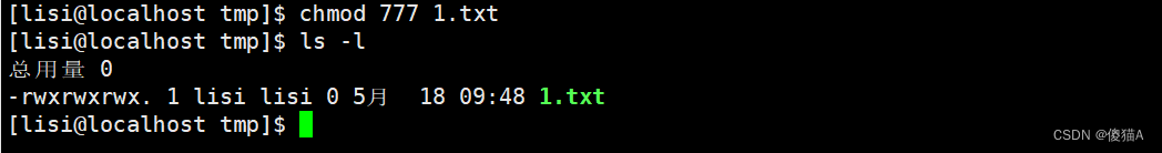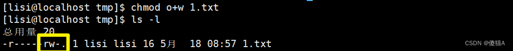 [lisi@localhost ~]$ chmod o+w /tmp/1.txt