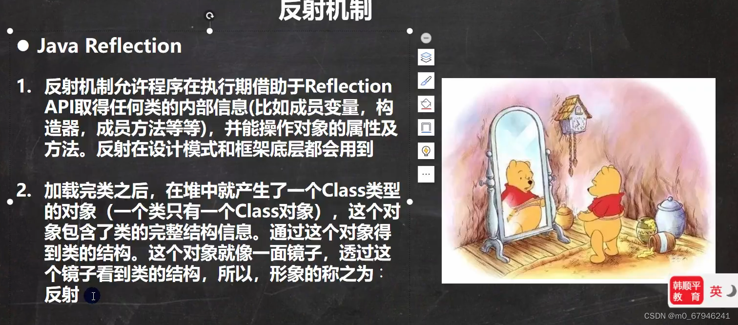 类的加载阶段:字节码文件会加载到加载区域。将class类对象放到堆当中。字节码文件到堆当中是使用了类加载器的classLoader的,类加载器就体现了反射机制。在底层,已经将放在堆当中对象的属性看成可以操作的对象了。类加载完之后生成对象。该对象知道他是属于那个class对象的。得到class对象之后,就可以对对象进行操作了。