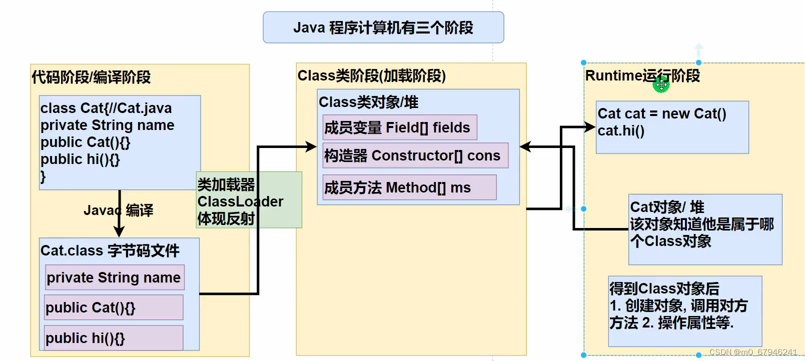编译阶段:类有属性和方法,构造器。Cat有hi方法,源代码当中会体现,经过Javac的编译,得到一个Cat.class字节码文件,会有属性,方法,构造器等等,