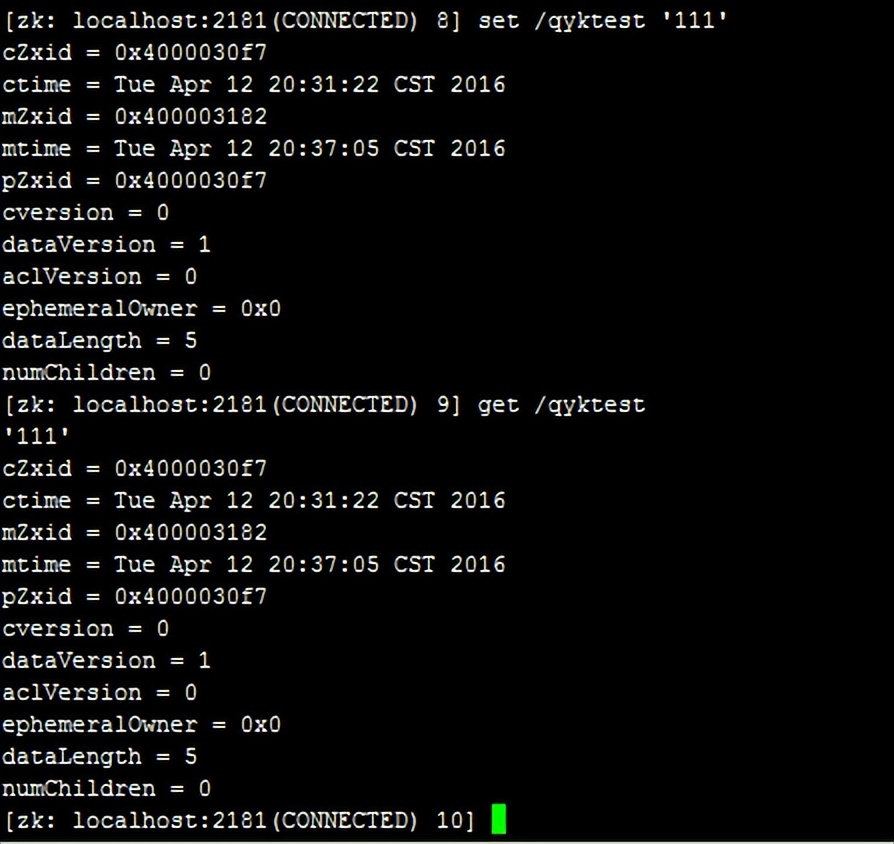 然后,我们可以执行set /qyktest‘111'修改节点的值,如下: