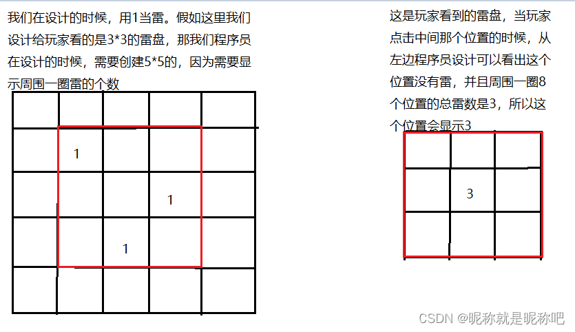 这里设计一个9*9的雷盘让玩家玩,所以我们程序员在设计这个雷盘的时候,需要创建11*11的雷盘 ,最主要的原因是因为9*9的每个无雷的位置,都会显示这个位置周围一圈的雷的总数。