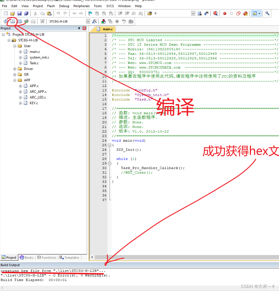 1.首先打开keil编译,以获得HEX文件