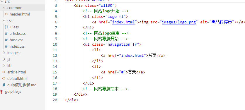 在gulpfile.js文件中调用gulp-file-include插件,抽取HTML中的公共代码,示例如下: