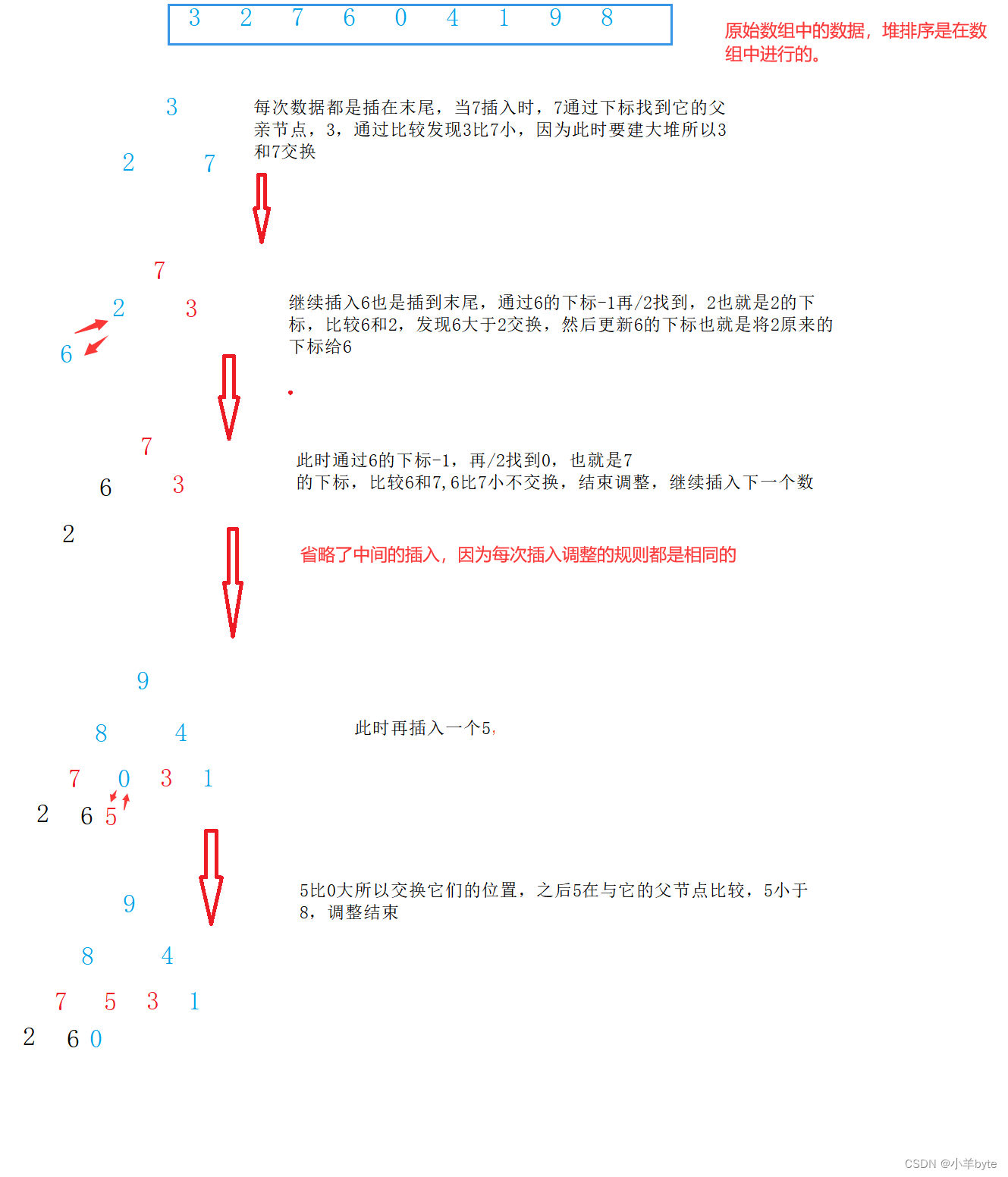 上面是一个大根堆,那么堆的向上调整算法是如何实现的呢?我们一起向下看: