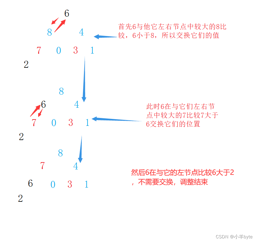 此时pop数据,先交换9和6,然后删除调数组末尾的9,从数组开头开始进行向下调整。如图: