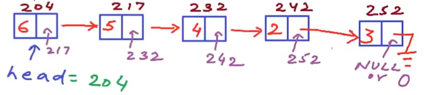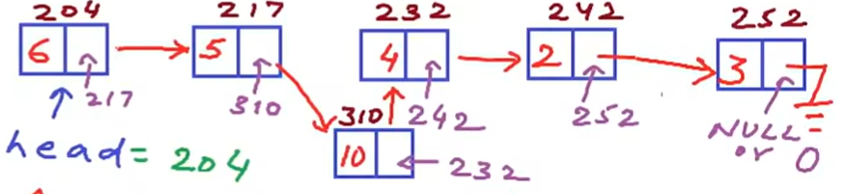 比如上面的数组内容,在链表的重新数据组织之下变成这样的非连续形式——