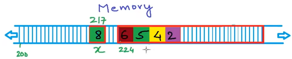 int x; 他想申请一块内存存储一个整数,他通过申明将其传达给内存管理器,内存管理器便给他开辟一块4字节的空间,假如这个内存是217(首字节的地址作为整个空间的地址),内存管理器便将217这个地址传回给应用程序,表明为你开辟的存储空间地址是217,你可以在这里存入任何你想存的整数。(假设之后存入了8,即x=8;)