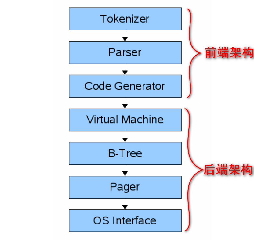 前端的输入是一个 SQL 查询。输出是 SQLite 虚拟机字节码(本质上是一个可以在数据库上运行的编译程序)。