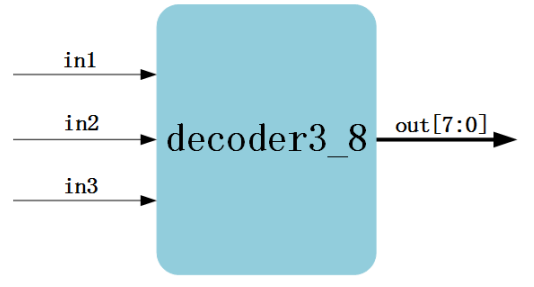 根据功能分析,该工程只需实现一个 3-8 译码器的功能,所以设计成一个模块即可。 模块命名 decoder3_8,模块的输入为 3 个 1bit 信号,输出为 1 个 8bit 信号,实现通过输入 3 个信号组成的二进制的 8 种情况来控制对应输出 8bit 的 8 种不同状态。根据上面的分析 设计出的 Visio 框图如图所示: