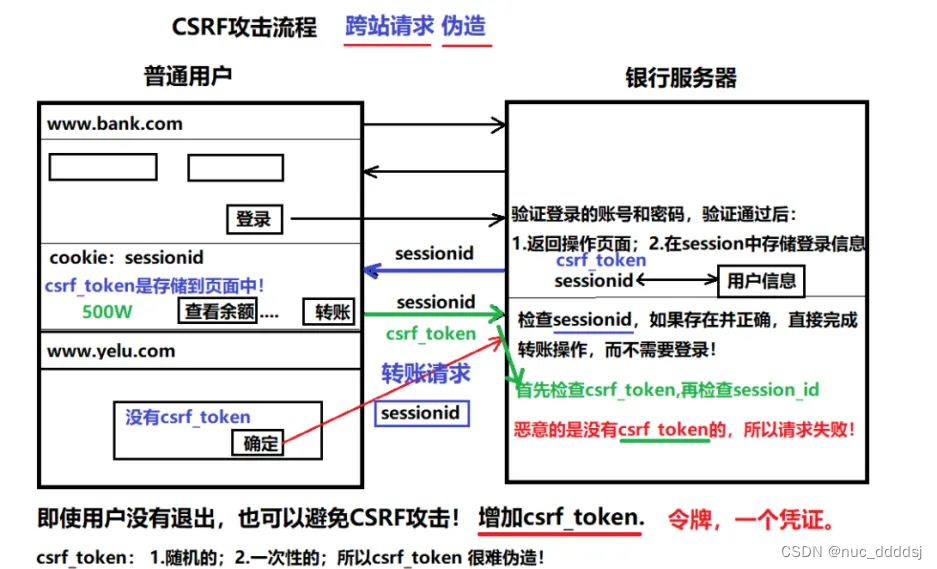 4用户提交请求后, 服务端验证表单中的Token是否与用户Session(或Cookies)中的Token一致,一致为合法请求,不是则非法请求。
