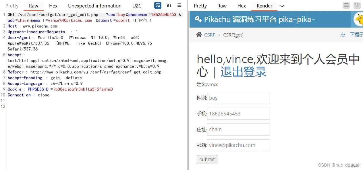 我们使用 pikachu靶场 来演示一下GET型CSRF的效果 , 首先我们来到对应的CSRF GET模块,其中存在vince/allen/kobe/grady/kevin/lucy/lili密码都是123456, 我们登录vince用户。 在修改个人信息处抓包发现该处功能点是GET方式传输并在参数中没有任何校验,这就造就了CSRF。