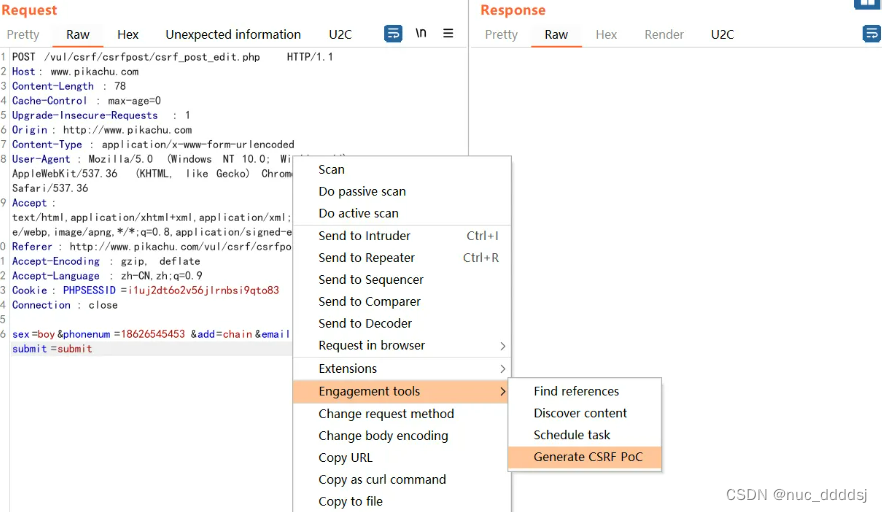 当一个危险请求是通过POST方式传输,且其中参数容易被攻击者进行伪造,那么该功能点处就可能造成 CSRF。 我们还是使用pikachu靶场进行演示分析