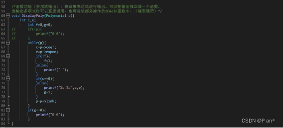 该函数是将最后的处理过的链表进行打印输出,用了一个while循环,当p不为空时,就一直循环,每输出两个数之间会输出一个空格,这里用一个f作为旗帜的,当f为1是输出空格,每次循环都会让f在0和1之间转变。然后当系数c为0是什么都不输出。