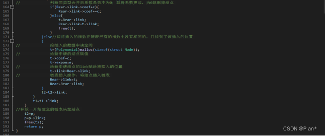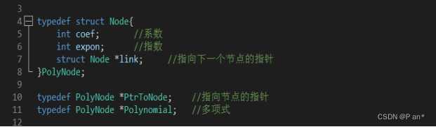 此代码定义了链表结点的结构体Node,该结构体内定义了两整型分别表示多项式的系数(coef)、指数(expon),还有一个结构体指针link指向下一个链表结点;然后定义的指向结点的指针变量,和指向多项式的指针变量。