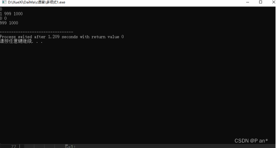 当是输入有零多项式和常数多项式这种情况是在GetPoly函数做一个判断当输入第一个数为0是就让链表为空,然后在DisplayPoly函数做判断,当链表为空是就输出“0 0”。