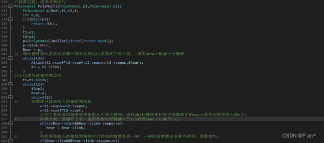 PolyMulti函数是将两个多项式相乘的函数;也是需要传入两多项式,判断多项式是否为空;创建一个新的表头,为了调用Attach的时候有地址空间可以用;通过循环将t1多项式的第一项分别乘以t2多项式的每一项;调用Attach形成一个初始链表,作用:因为下面的双层whil循环是包含一项比较指数的代码的,所以先创建一个多项式链表给下面的代码作为比对指数大小的;然后让t1多项式指向第二项,然后通过双层while循环用t1多项式的第二项之后的每一项来乘以t2的每一项;为了是形成的链表按照指数从大到小排列,通过while循环来比较已有链表中的expon是否比即将插入的e大, 如果大就一直循环下去,直到找到比即将插入的e小或者Rear->link为null ;然后就是判断即将插入的指数和链表中已存在的指数是否一样,一样的话就要合并同类项,系数相加;如果同类项合并后系数是否不为0;就将系数更改,为0就删掉结点;如果即将插入的指数在链表已有的指数中没有相同的,且找到了该插入的位置,给插入的数据申请空间,给新申请的结点赋值,进行链表插入操作,将结点插入链表,最后释放一开始建立的链表头空结点。