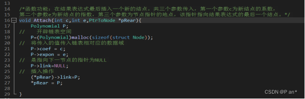 Attach函数的作用是给链表插入新的结点,三个参数传入,第一个参数c为新结点的系数,第二个参数e为新结点的指数,第三个参数为节点指针的地点,该指针指向结果表达式的最后一个结点,通过第三个参数,找到新节点插入的位置,将传入传系数,指数赋值给新节点的coef、expon;然后让链表的最后一个结点的link为NULL。将新的连赋值给指针节点指针。