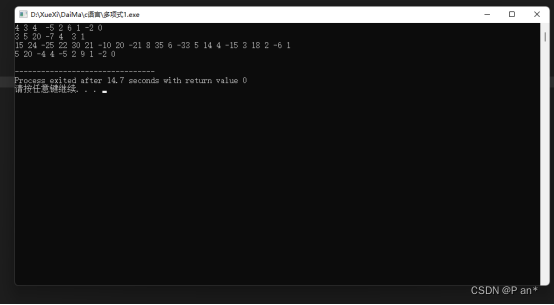 通过两个多项式相乘的输出为:15 24 -25 22 30 21 -10 20 -21 8 35 6 -33 5 14 4 -15 3 18 2 -6 1