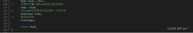 函数功能:销毁存储多项式的链表空间,在进行多项式乘法的过程中,会借助链表存储运算的中间结果(即中间结果多项式),当计算出运算结果后,可将中间结果多项式删除。