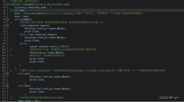 PolyAdd函数是两个多项式的加分运算代码,他需要传两个参数,分别是p1和p2,这两参数是指向多项式的指针;创建一个新的表头,为了调用Attach的时候有地址空间可以用;然后用while循环(循环条件是p1和p2都不为空)进行判断两个多项式各项的指大小,做出不同的操作;为了保障形成的链表中是按照指数从大到小来排列的,所以需要对多项式各项的指数进行比较,比较厚进行该操作:谁指数大先传谁进Attach函数成为新节点,相同系数相加后再传,传后链表末尾结点的link移一位 。当p1和p2有一个多项式的相加完后也就是p2->link或p1->link为NULL时;将剩下多项式的项用while循环一个一个都复制到新的链表末尾。然后让结果多项式的的尾项指针的link为NULL,最后让head指向结果多项式的第一个非空项 , 释放空结构 。