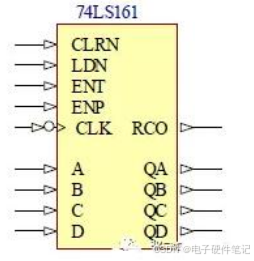 这里选择用十六进制计数器 74LS161 实现,原理很简单:用 74LS161 实现N(N<16)进制计数器,只需当计数器从 0000 增加到 N-1 时让 74LS161 清零即可。 对于 7 进制,当增加到 6(0110)时将计数器清零即可。下面简单介绍下74LS161,下图为 74LS161 的原理图: